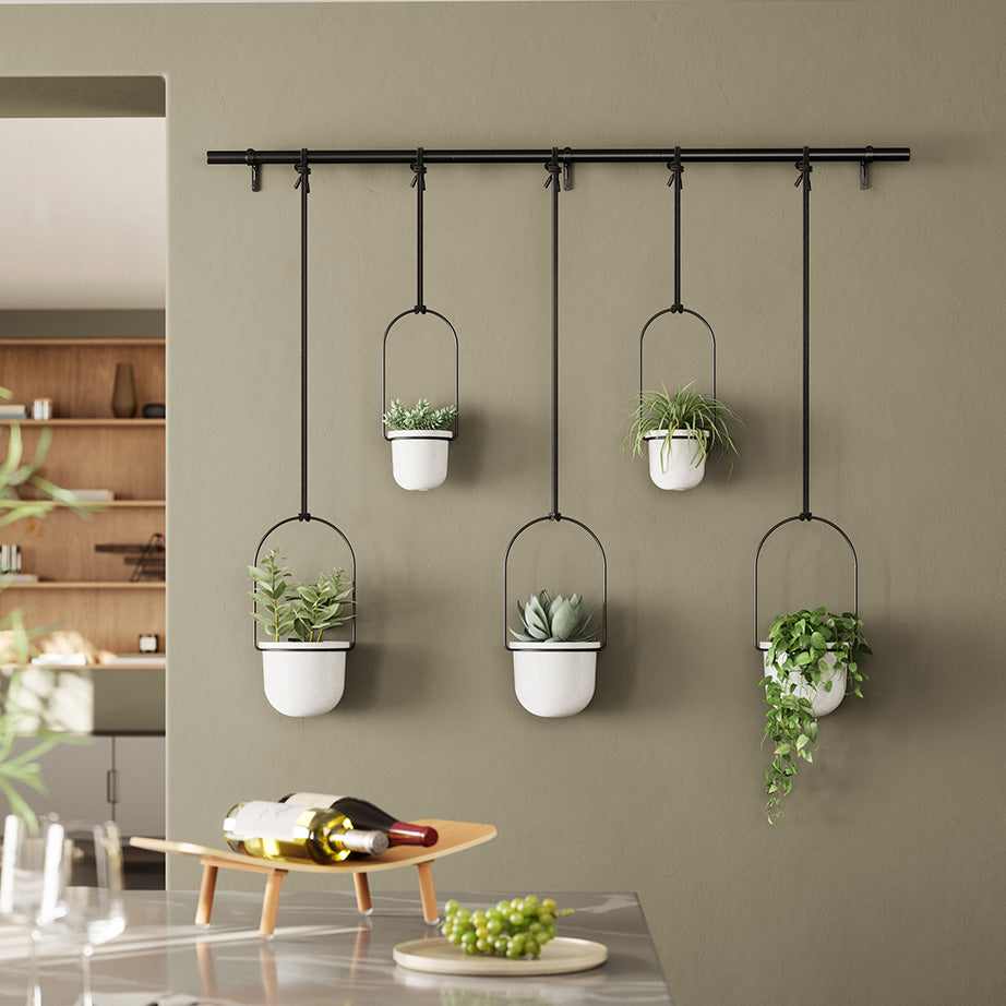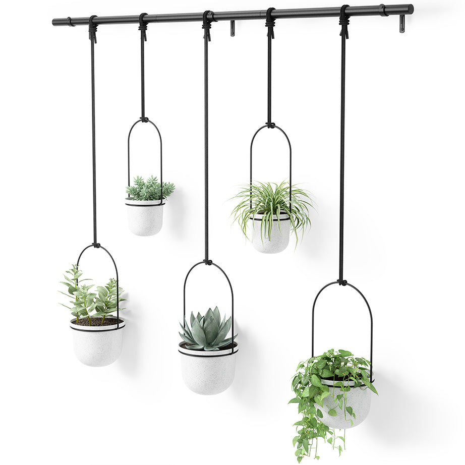 Hang a trio or quintet of potted plants in your window for a great natural display. Triflora, designed by Chris Snell and Dayna Mailach for Umbra, uses the utility of a drapery rod to hang three durable white pots that are great for growing herbs, succulents, or vines. Triflora can be mounted from the wall or ceiling, saving space on window sills, tables, or countertops. Adjust the length of the each rope to customize the placement of the hanging planters.