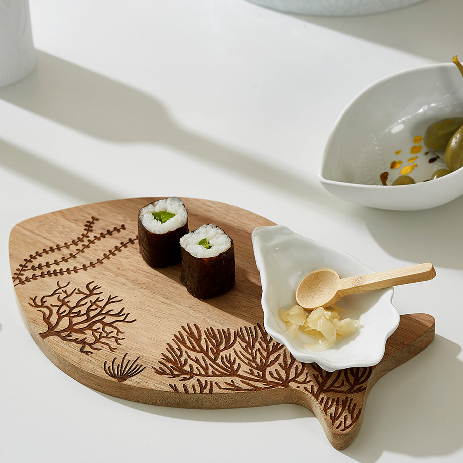 Serving will go swimmingly with pieces from the Underwater World Collection from Räder. This aquatic themed collection includes an acacia wood tray with a delicate lasered design, a two-piece porcelain tray and a porcelain bowl, both decorated with golden schools of fish.