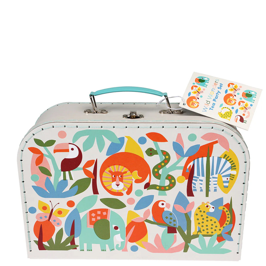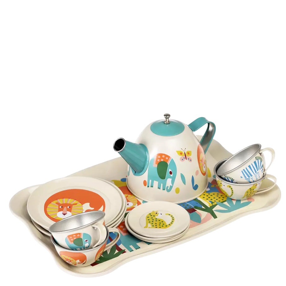 Host your own tea party with this charming set from Rex London's Wild Wonders Collection. Stowed neatly in a case, the set includes a colourful tin tea pot, four tea cups, four saucers, and a tray.